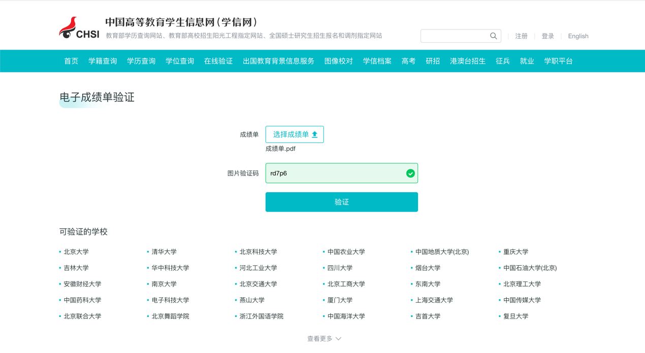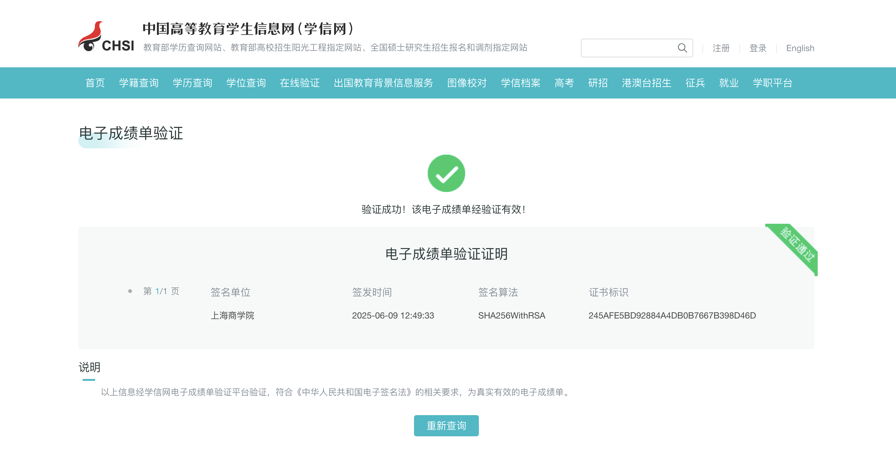 学信网:在学信网“电子成绩单验证”功能进行校验。地址:https://www.chsi.com.cn/cjdyz/index