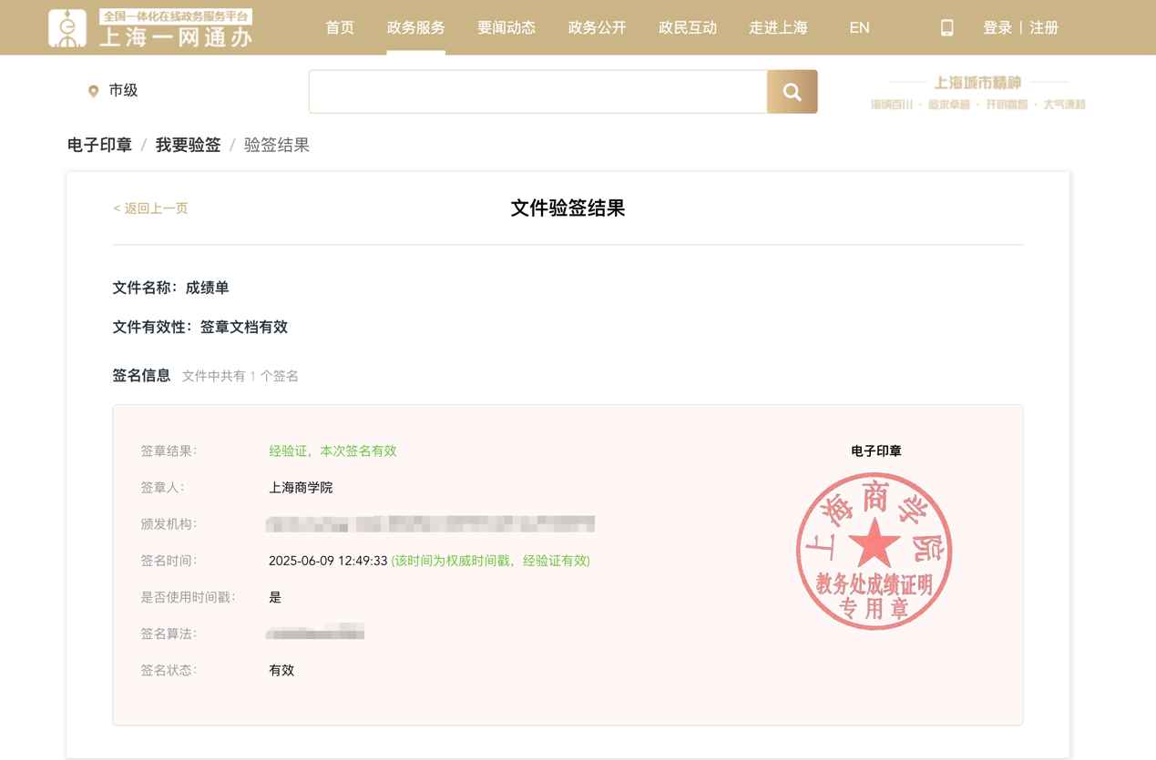 为推动学校数字化转型,推进“让数据多跑腿、让师生办事顺”,云上商数字门户已上线包含电子签章功能的电子成绩单,该电子签单具备可信认证功能,可在上海市“随身办”、“学信网”直接验证文档真实性。现将有关操作流程说明如下: