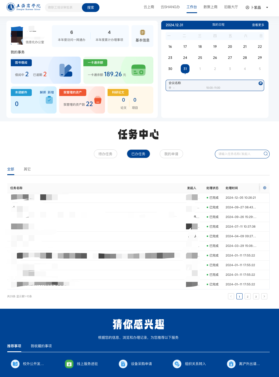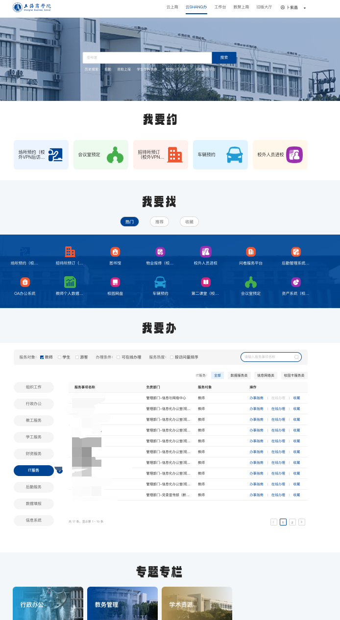 为了进一步提升师生办事体验,门户单独开辟"云SHANG办"模块,集"预约、办事、系统服务"一体,为师生提供个性、便捷的服务体验。