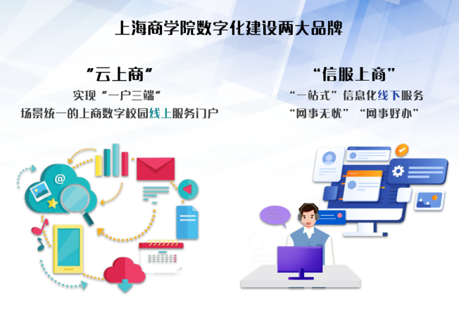 坚持让数据多跑路,让师生少跑腿"宗旨,依托新版数字门户打造"云上商"线上服务品牌,云上汇聚多个业务系统入口及办事项,实现"一户三端"即PC端(云上商数字门户scloud.sbs.edu.cn)、移动端APP(i上商)、微信(上海商学院服务号)的场景统一的上商数字校园线上服务门户。同步积极创设线下服务窗口"信服"上商一站式信息化服务站,承载网络报修、一卡通服务等实体业务,让师生"网事无忧"、"网事好办"。