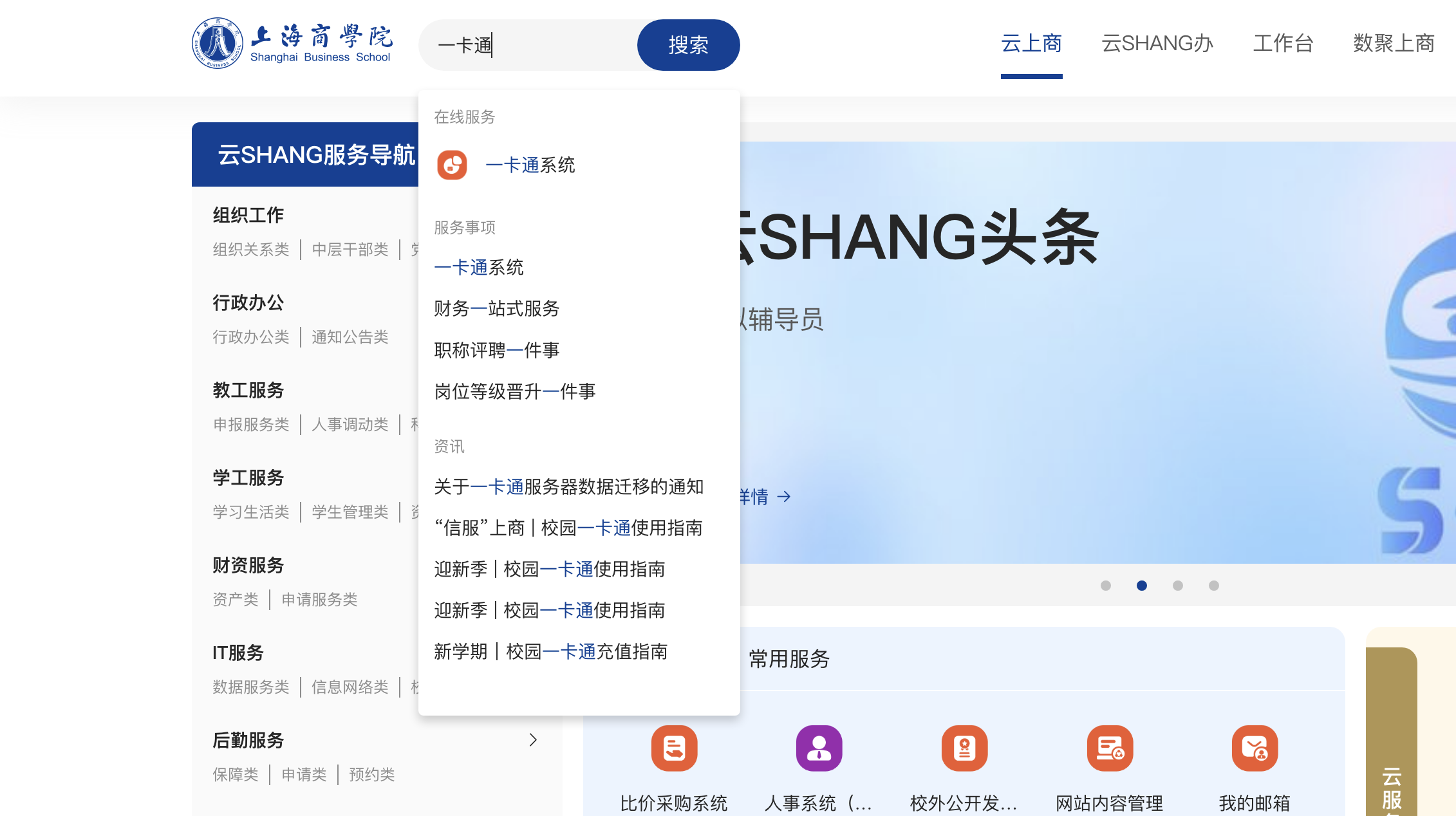 "云上商"首页汇聚学校的各类系统入口、服务应用及直观的数据展示,让师生可以"一站式"轻松访问所需资源。特别升级首页全站搜索功能,支持多维度信息分类与快速检索,全平台"一搜直达",搜索范围覆盖业务系统、服务事项、站内新闻,一触即可到达所需服务事项或资讯,进一步简化师生操作路径提升效率。