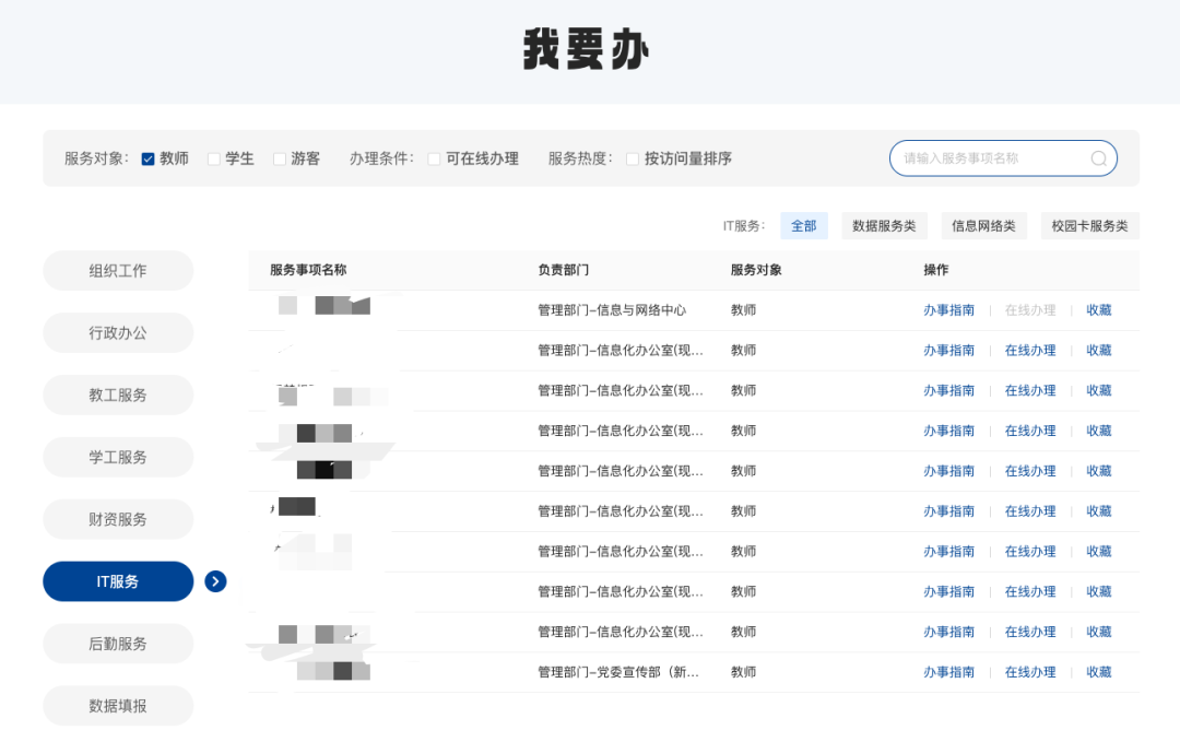 云shang办【我要办】模版将服务在9大核心业务领域分类后,还提供按不同身份(学生、老师、游客)、办理条件(在线办理)等多种筛选形式及按访问量排序功能,帮助师生更加快速的找到所需要的服务。